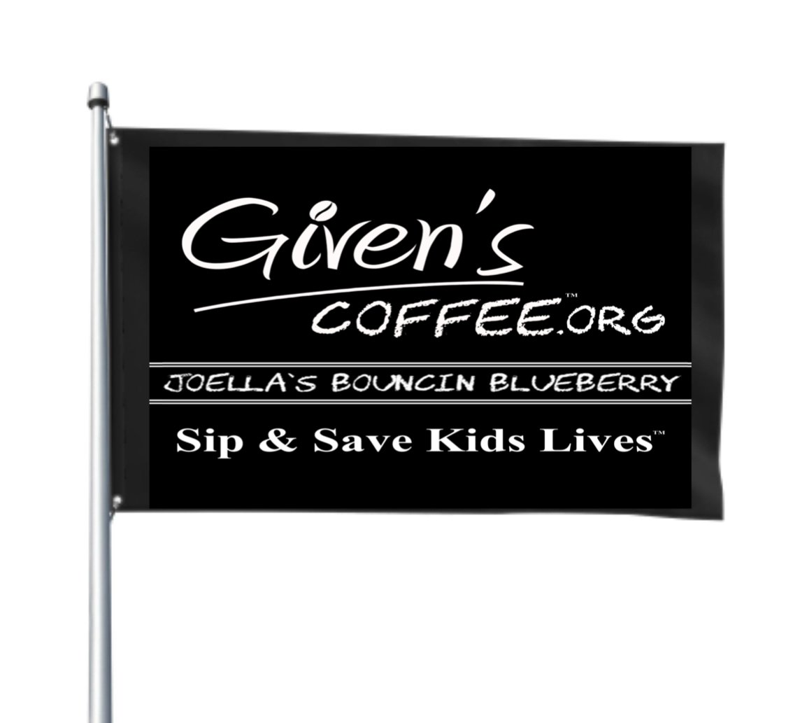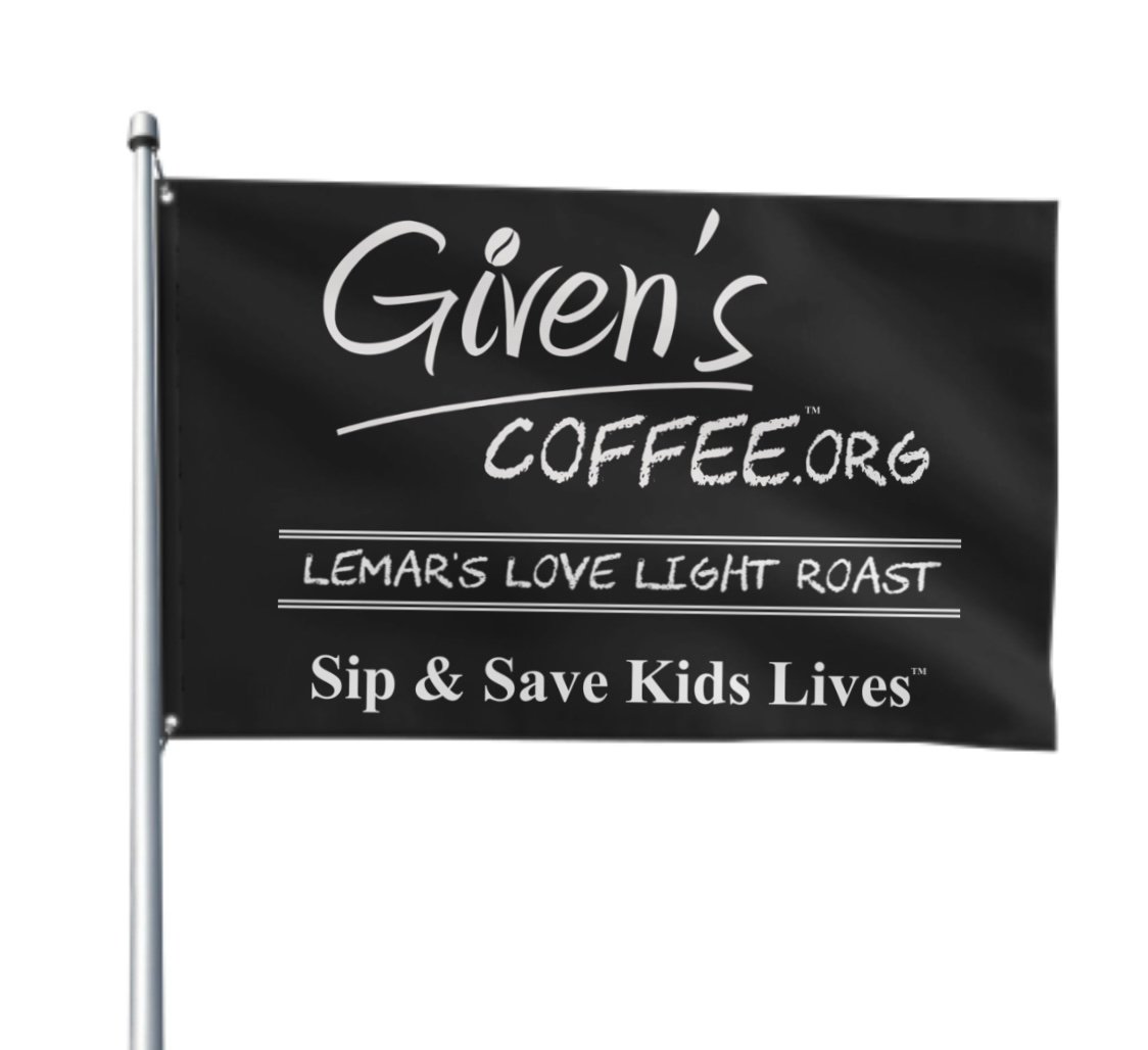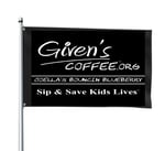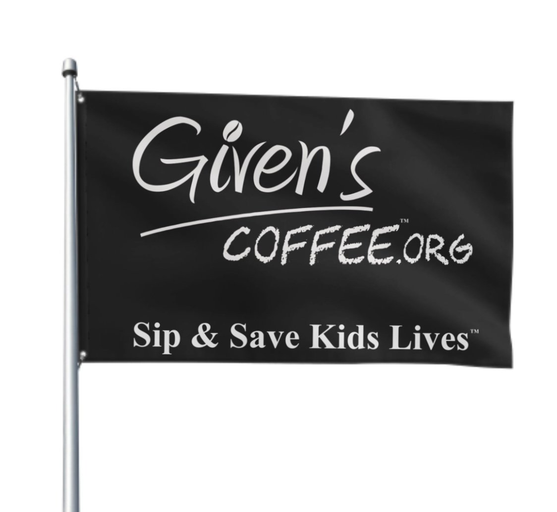 Show big support with a 3x5 Given’s Coffee™ Flag. Fits in your pocket for convenience & a fast way to show BIG support with a large flag. Hang in your place of business, take to a supporting event, fly outside of your house, table display for those selling Given’s Coffee in stores or just pull it out of your pocket to randomly show the world your support. Thank you so much for baring our Sip & Save Kids Lives™ flag
